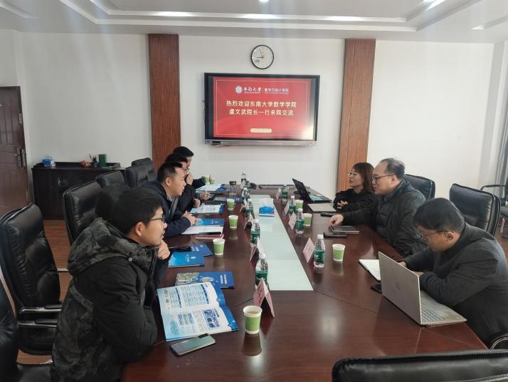 11月29日上午,东南大学数学学院院长虞文武、副院长许文盈一行4人到访中南大学数学与统计学院,开展调研交流。中南大学本科生院院长焦勇,数学与统计学院副院长(主持工作)刘源远,副院长潘克家、吴恋、周岳及教师代表参加了会议。