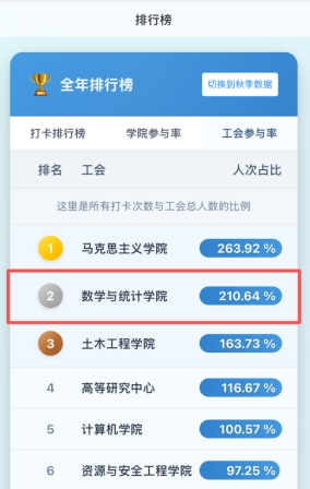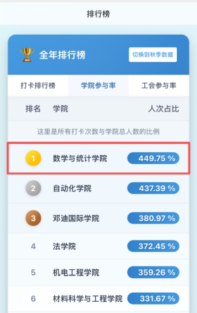 近日,中南大学2025年“越麓拾秋”登山季圆满落幕。数学与统计学院积极响应学校“趁青春,去登山”主题号召,全院上下凝心聚力,交出亮眼“体育育人”答卷。据“悦动青春”排行榜数据,数学与统计学院学生全年参与率达449.75%,居全校第一;工会全年参与率达210.64%,位列全校第二。这份优异成绩充分彰显了学院将体育精神深度融入“三位一体”铸魂育人工程之显著实效,体现出立德树人全过程的坚定步伐与创新实践。