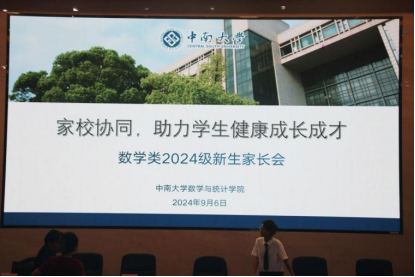 2024年9月6日,中南大学数学与统计学院2024级本科新生家长见面会在数学与统计学院134报告厅顺利举行。数学与统计学院党委杨雪宾副书记、校心理健康教育中心祁琪老师、学院全体辅导员和新生家长参与会议。会议由2022级辅导员王孟正主持。