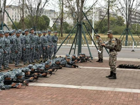 当“战士打靶把营归,把营归”的歌声响起之时,身着青绿军装的新生们在等待中倍感兴奋。“听到‘卧倒’后,左脚向前一步,左腿弯曲,上体前倾……”随着教官口令下达,同学们枪托抵肩、贴腮、屏息,动作一气呵成。