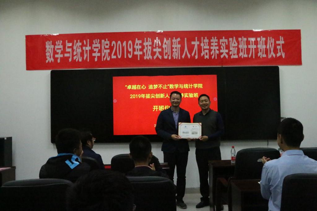 2019年10月15日8:30,数学与统计学院于数理楼145学术报告厅举办“卓越在心,追梦不止”数学与统计学院2019年创新拔尖人才培养实验班开班仪式。院长焦勇教授、院党委安少波副书记、班导师徐宇锋老师、郭铁信教授、刘伟俊教授、19级辅导员王孟正老师以及T1901班全体同学参加了本次仪式。仪式由安少波副书记主持。
