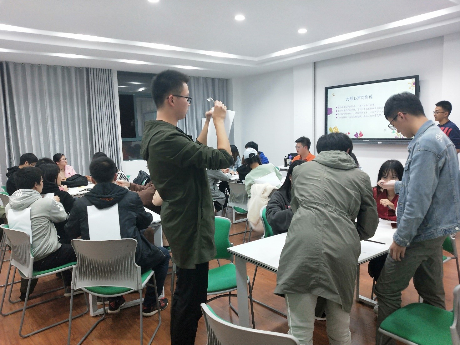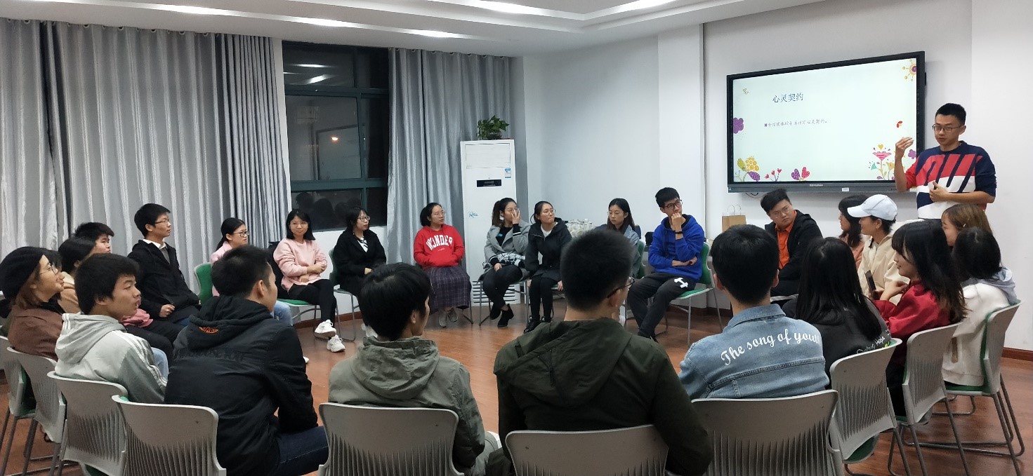 活动伊始,刘昱辰老师组织同学们开展小游戏来缓解拘束的氛围。之后,刘昱辰老师引导同学们一起制定了“真诚、投入、享受、一心一意”的心灵契约。接着,同学们被随机分为四组。