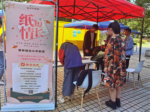 11月11日至12日,由数统院、物电院、建艺院和法学院联合举办的“纸短情长”活动如期举行。此次活动旨在丰富同学们的课余生活,增进同学之间的情谊,提高同学们的人际交往能力,为同学们提供一个表达心声的机会。