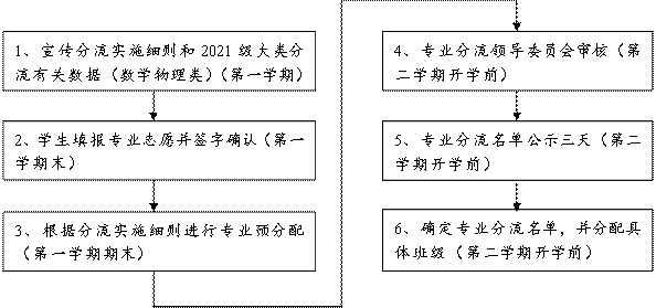 数学物理类专业分流工作从大一第一个学期末开始(具体时间以本科生院的通知为准),流程如下: