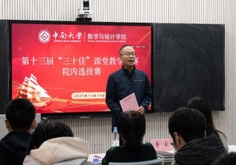 为进一步引导教师潜心育人,提升教师教学水平,2025年12月10日14时30分数学与统计学院第十三届“三十佳”课堂教学竞赛院内选拔赛在数理楼245教室正式拉开帷幕。湖南大学彭豪副教授(第五届全国高校青年教师教学竞赛理科组一等奖)、中南大学刘再明教授、秦毅红教授、王小玲教授、谢斌教授五位校内外专家应邀担任评委,学院党委副书记杨雪宾主持。经报名选拔,共8名青年教师同台竞技。