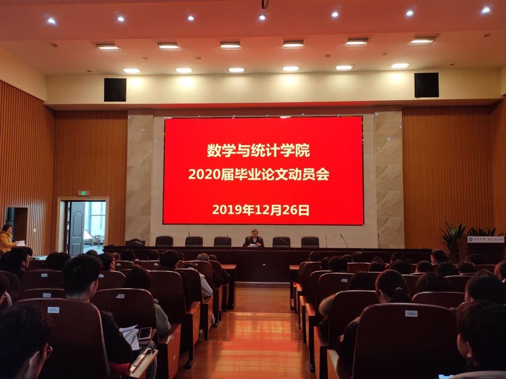 为做好2020届本科生毕业论文(设计)工作,进一步提高毕业论文(设计)水平和人才培养质量,数学与统计学院于2019年12月26日下午3:00在数理楼134报告厅召开了2020届本科毕业论文(设计)动员会,会议由数学学院教学副院长郑洲顺教授主持,2020届所有的本科毕业论文指导教师和2020届毕业生参加了会议,参会人数达270人,会议对2020届的本科毕业论文的各项工作做了详细的安排,重申了数学与统计学院本科毕业论文(设计)实施细则及其工作条例,对学校与学院的本科毕业论文(设计)的各项规定进行再次的学习与强调。